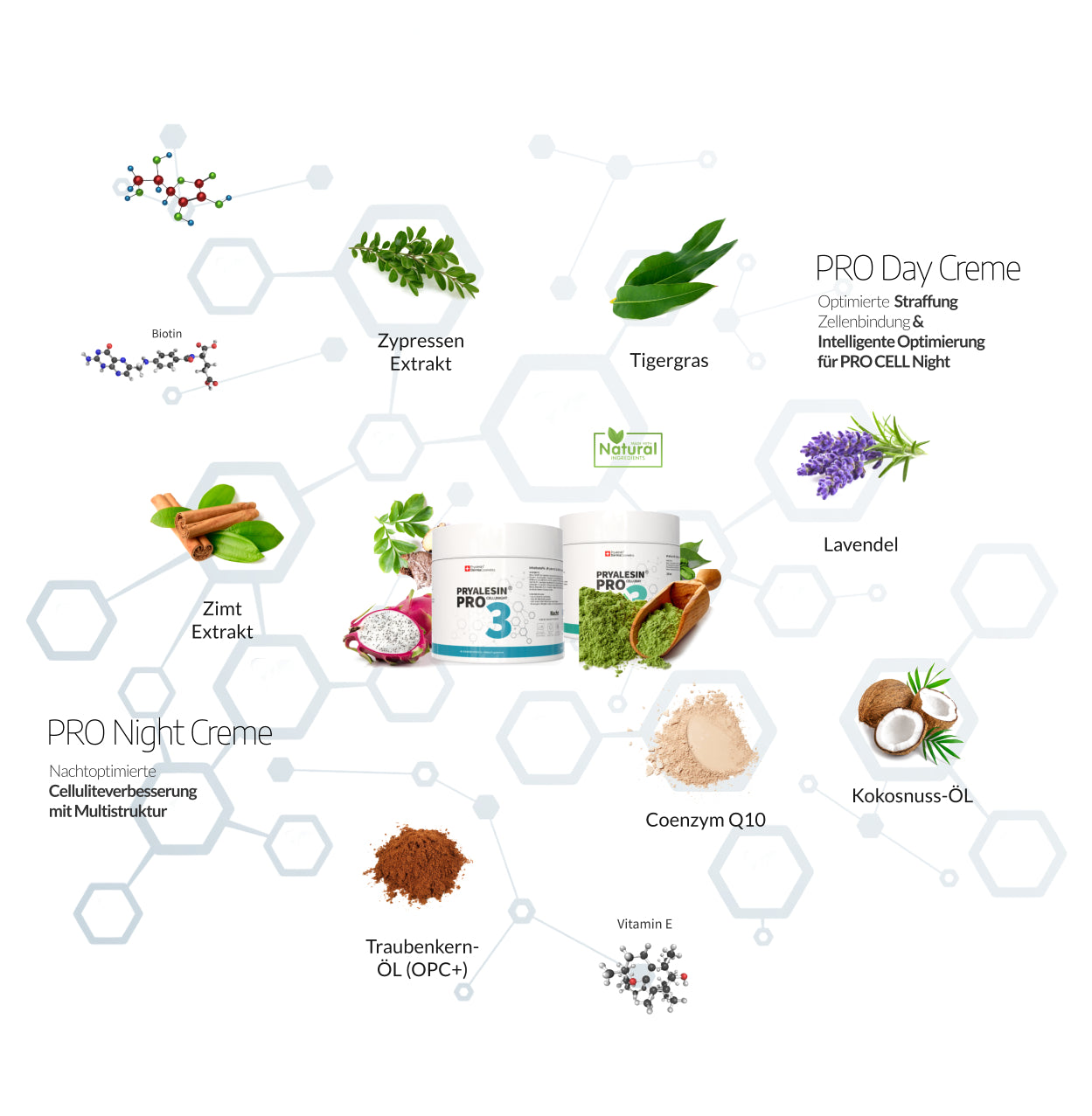 PRYALESIN® Pro ist die weltweit erste Kombination aus einer Tag- und einer Nachtcreme gegen Cellulite. Während die Nachtcreme die Poren der Haut vorbereitet und öffnet, kann die Tagescreme tief in die unteren Gewebezellen vordringen und Cellulite bereits innerhalb weniger Wochen sichtbar reduzieren. Dieses Konzept basiert auf wissenschaftlichen Daten und macht PRYALESIN® Pro um ein Vielfaches wirksamer als Cremes anderer Hersteller.